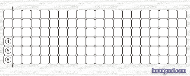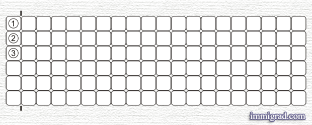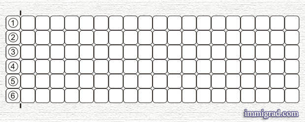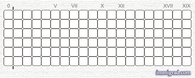Лады будут располагаться вертикально слева направо. Самый крайний левый столбец - это нулевой лад, на нём звучат неприжатые струны гитары. Обозначается он цифрой «0». Последующие за ним лады требуют прижатия струн, располагающихся над ними, левой рукой. Обозначаются гитарные лады римскими цифрами. Если Вы их не знаете, то пришло время изучить: I, II, III, IV, V, VI, VII, VIII, IX, X, XI, XII, XIII, XIV, XV, XVI, XVII, XVIII, XIX.